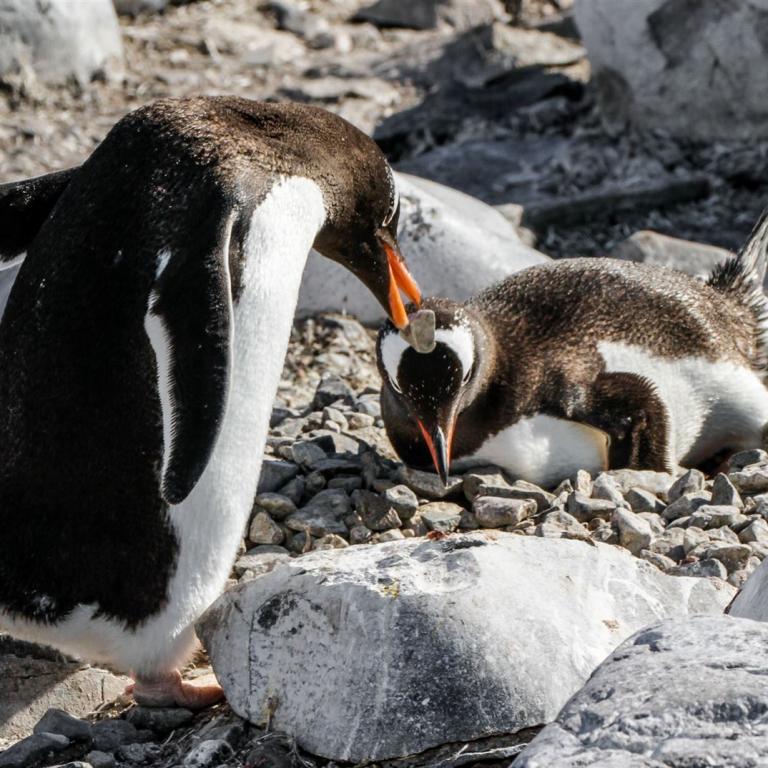 Viele springende Eselspinguine rund um unser Schiff kündigen bereits die Nähe der Kolonie an. Sie streben dem Strand entgegen, und bei dieser Fortbewegungsart sollen sie die höchste Geschwindigkeit erreichen. Pinguine können also wohl doch fliegen, wenn auch nicht sehr weit und mit jedem Sprung nur ein paar Meter weit.